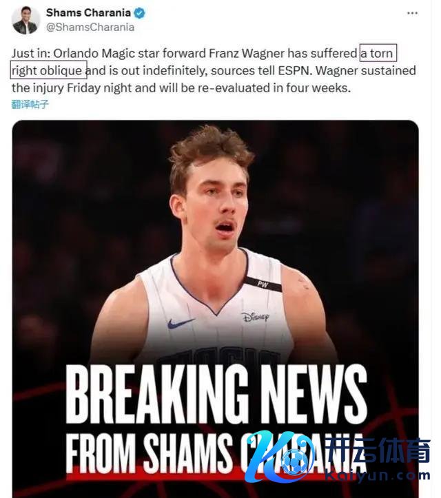 把柄闻名的 ESPN记者 Shams的说法,来自 NBA的音信称,奥兰多魔术队的弓手弗朗茨瓦格纳由于右腹部的肌肉拉伤而暂时不成上场,四个星期之后他将会再次进行伤病检查。弗朗茨瓦格纳被以为是在和费城76东谈主队的一战中受伤的。