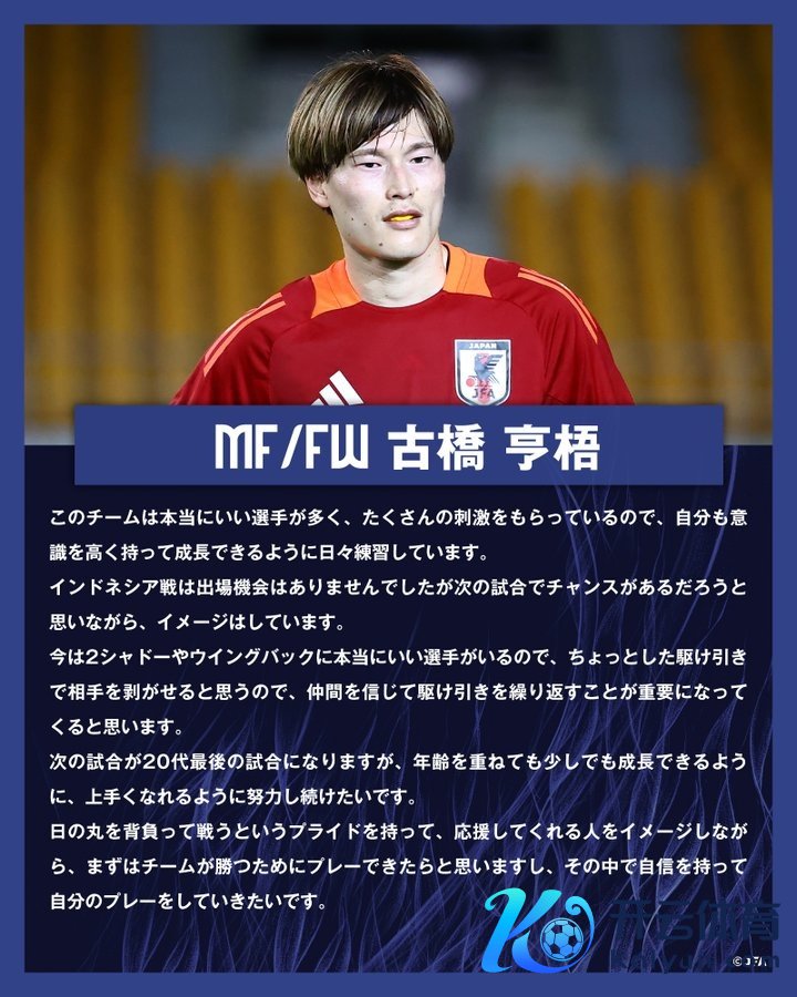 古桥亨梧:“这支球队如实领有好多优秀的球员,我从中得回了许多激发,因此我每天王人在勉力磨砺,但愿能保握精好意思的斗志并束缚跳跃。固然在对阵印度尼西亚的比赛中莫得出场契机,但我合计下一场比赛(对中国队)可能会有契机,是以一直在进行表情准备。